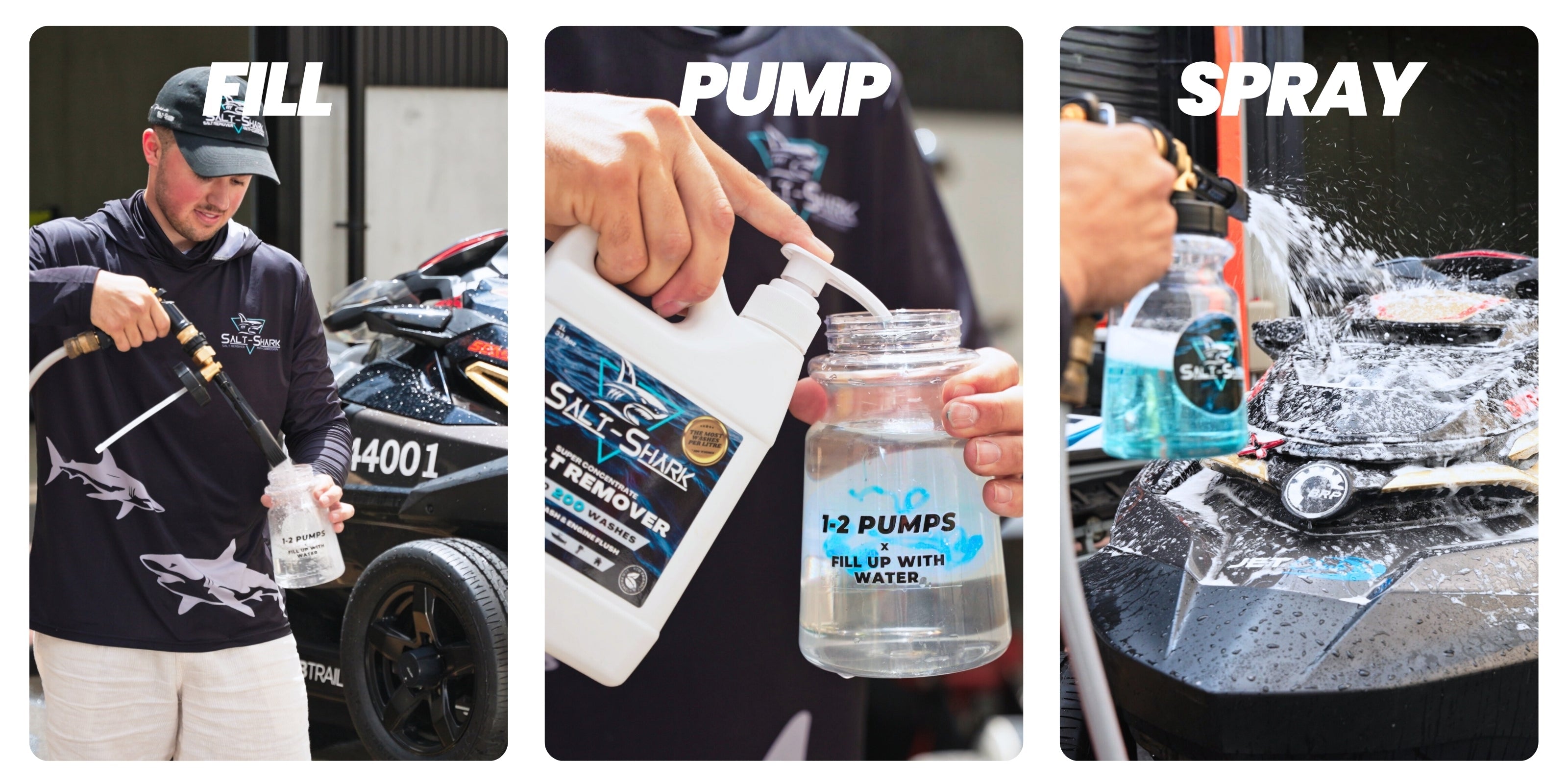 2. Mix & Spray – Fill the sprayer container with water, then add 1-2 pumps of Salt-Shark. Mix until it changes colour.